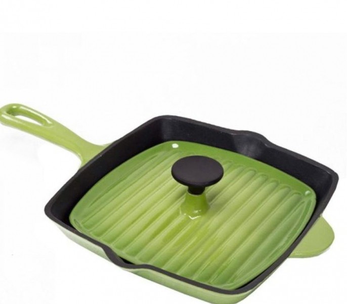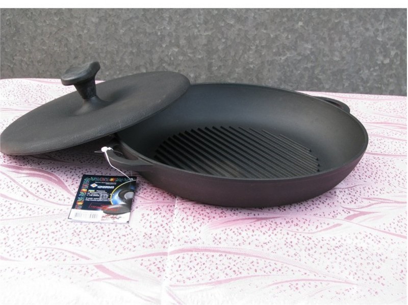 Чугунная сковорода гриль – это удачный гибрид стандартной сковороды и духового шкафа. Производители умело совместили в ней возможность готовить еду над раскаленным дном, не касаясь его, что позволяет сохранить больше питательных веществ, при этом, не нарушив вкусовые качества продуктов.