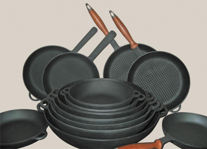 - Чугунная сковорода для блинов. Незаменимая вещь в хозяйстве, а значит должна быть в каждом доме. Фирма предлагает следующие параметры таких сковород: высота до 2 см; диаметр от 22 до 25 см; вес около полутора килограммов. Не имеет внутреннего покрытия. Изготовляются только в черном цвете. Толщина боковых стенок и дна составляет 6 мм. Изготовляется со съемными ручками из стали или бакелита. Продается без крышки. Подходит для любых видов плит. Можно использовать в духовке и мыть в посудомоечной машине. Цены на сковороду блинную чугунную могут колебаться от 700 до 1300 рублей.