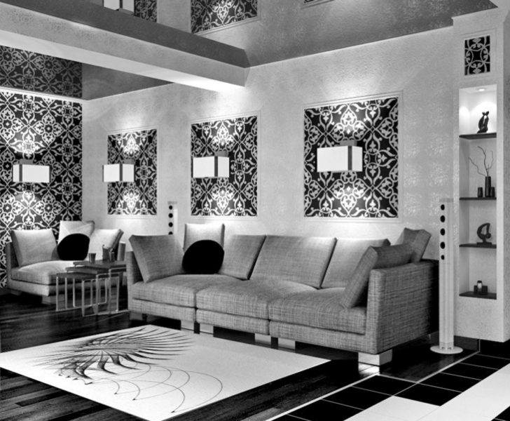 Обои двух цветов в комнате больших размеров позволят создать максимум комфорта. В ситуациях, когда лишнее пространство олицетворяет пустоту, такой вариант является одним из лучших способов решения проблемы. Для того чтобы уменьшить интерьер, используйте комбинации обоев цветов из темной палитры: например, синего, черного, серого, темно-коричневого. Дополнить эффект можно обоями с узорами и орнаментами больших размеров.