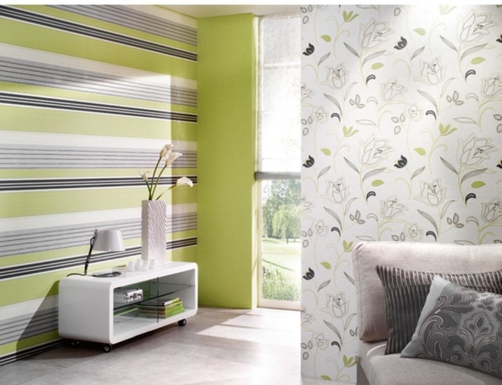 В современных интерьерах красиво выглядят горизонтально приклеенные полосатые обои, которые помогают создать определенную динамику в помещении. Однако, стоит помнить о визуальном эффекте горизонтальных полосок, потому что они расширять пространство, но при этом несколько занижать потолки.