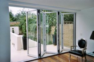 Дверь-гармошка по конструкции чем-то напоминают ширму. Несколько створок соединены в одно целое и при открывании складываются по принципу гармошки, откуда и произошло название конструкции. Поскольку двери состоят из нескольких частей, проникновение света в комнату ограничено. Складные двери производятся шириной до 6 м и высотой 2,5 м, поэтому подходят для установки в больших проемах. Изготавливаются из пластика и алюминия. Простота конструкции, также позволяет использовать для изготовления двери древесину. Так же, как в случае с раздвижной дверью слайдинг, «гармошка» не плотно прилегает к коробке и, как следствие, плохо сохраняет в комнате тепло.