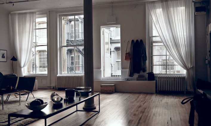 Много внимания уделяется естественному освещению. Большие незашторенные окна — отличный способ создать просторное воздушное пространство. В крайнем случае используют горизонтальные или вертикальные жалюзи.