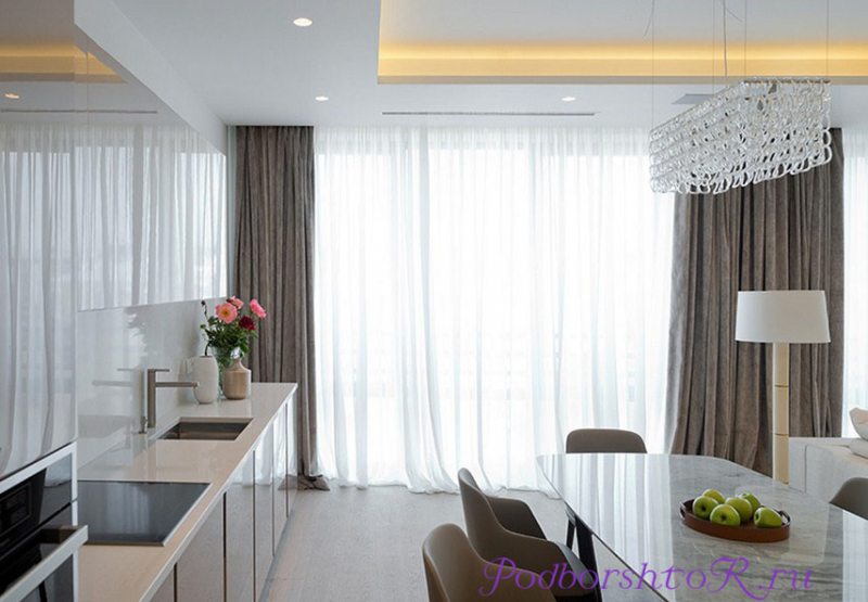 Ее важно выделить, так как комната призвана приветствовать гостей, собирать родственников, использоваться для встреч и прочих мероприятий, когда присутствуют посторонние люди. Для нее важно выделение проемов темными цветами, если мебель светлая и наоборот. Одними рулонными вариантами в гостиной не обойтись, поэтому рекомендованы строгие занавеси и шторы на люверсах в пол.