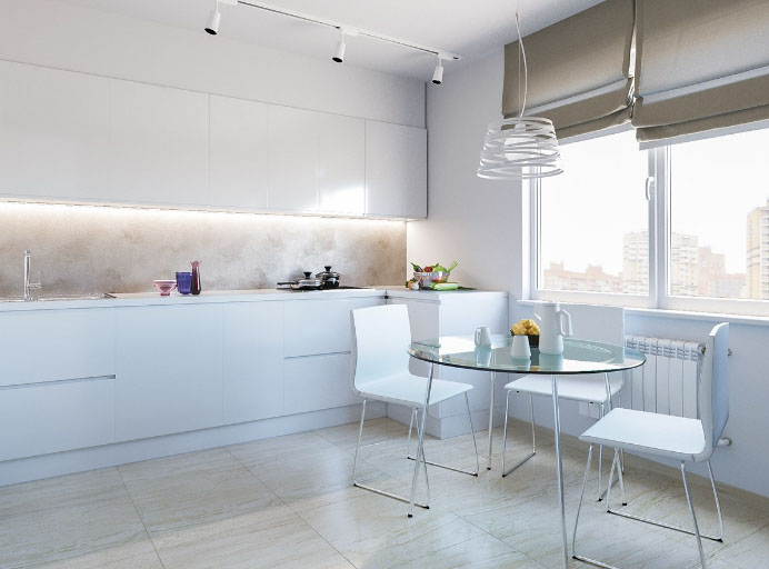 Как правило, минимализм для штор в кухне – это разнообразные жалюзи, римские или японские полотна. Они отличаются выгодной функциональностью – не пропускают свет, просты в уходе, и красотой. Используя приглушенные, но конкретные оттенки и цвета, кухню оживляют, вносят необходимый уют.