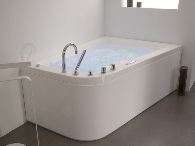 Не слишком дорогая ванна выполнена в обычной прямоугольной форме. В ней предусмотрена съемная фронтальная панель, а также комфортные подлокотники, подголовник и бортики. Такая конструкция позволяет расслабиться после тяжелого дня. Еще одним плюсом является покрытие дна, за счет которого влажное тело не скользит по нему.
