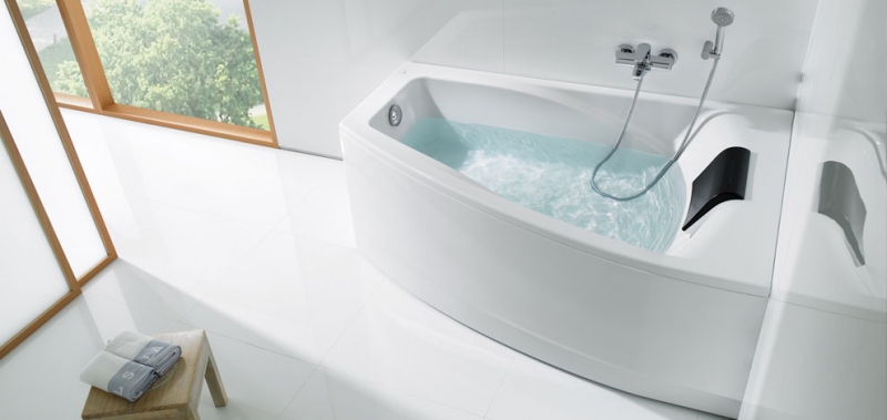 Отечественная ванна с угловым дизайном славится интересной формой, малыми габаритами и достаточной вместительностью. Она позволяет экономить пространство в комнате, поэтому идеально подходит для установки в малогабаритных квартирах. Для удобства тут предусмотрены подголовник и спинка. А дополнительно расслабиться помогают системы аэро- и гидромассажа.