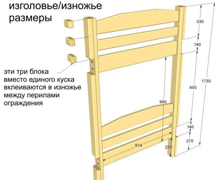 Изножье делается так же, как и спинка, отличие лишь в количестве перекладин. Основание второго этажа будет ложиться на верхние части спинки с изголовьем, поэтому важно, чтобы они были на одном уровне.