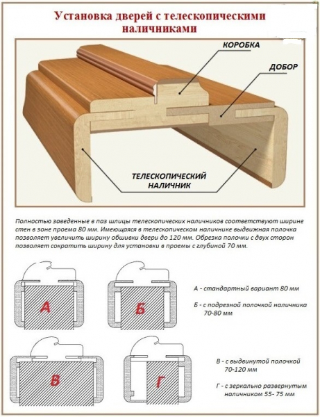 Подобные обрамления годятся для монтажа без закрепительных деталей. Телескопические изделия не требуют применения добавочных доборов, поскольку выправлять зазоры между устройством и шириной дверного проема допустимо выравниванием раздвижного обрамления. В таком случае шпунт в виде бородки вводится в углубление на коробке двери.