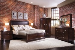 В спальне кирпичная стена прекрасно расположится над изголовьем кровати. Чтобы интерьер не получился слишком грубым и прохладным, уравновесьте фактуру кирпича мягким текстилем, легкими занавесками и ковром.