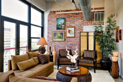 Красота кирпичных стен привносит тепло в небольшую жилую площадь и делает его обстановку маняще домашней.