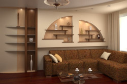 - Гипсокартон подойдет любителям всех стилей. Такой вариант позволяет проявить фантазию. Поклонники минимализма могут сделать разнообразные полочки и ниши для хранения сувениров, фоторамок или других небольших вещей. Те, кто предпочитает классический стиль, могут сконструировать из материала барельеф, внутрь которого вмонтирована подсветка. Это создаст в комнате особый уют и комфорт.