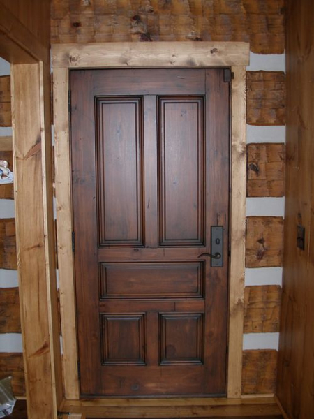 Это уже двери из честного массива, как правило из массива сосны, экологичные, с атрибутами натурального дерева: ярко выраженной фактурой и даже запахом. Но все же и здесь остаются некоторые минусы, главными из которых являются опять же нетвердость материала и боязнь влаги. Визуально двери отличаются обилием пороков древесины: сучки, смоляные карманы, разнотон и т. д.