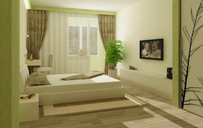 Немного романтичности и расслабленности привнесут белые, бежевые, розовые, васильковые, светло-желтые портьеры в спальню. Очень приятное сочетание спокойного светло-зеленого оформления стен с коричневыми обоями.
