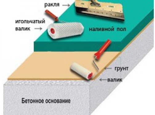 Ниже представлена схема устройства наливного пола на бетонное основание, а также необходимые для работы инструменты.