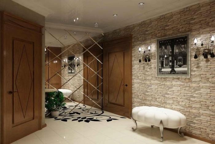 Необычная отделка прихожей декоративным камнем и обоями: фото нестандартных решений