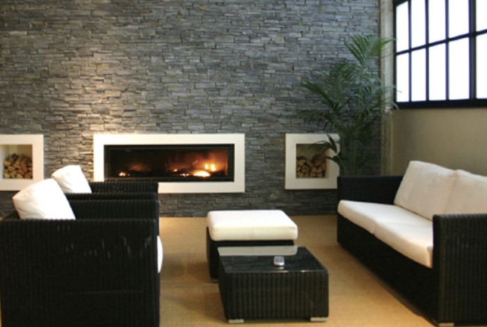 Интересным вариантом дизайна является отделка стен декоративным камнем из цемента. Этот материал не подвержен горению и его нельзя поцарапать предметами обихода.
