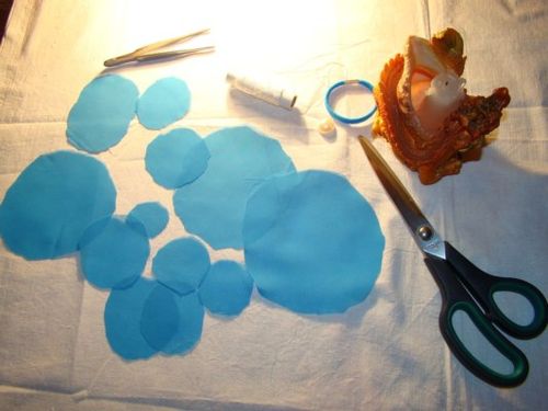 Для каждого цветка, мне понадобилось по 7-мь, таких круглых лепестков. Дальше, с помощью термопистолета, склеила все 7-мь лепестков.