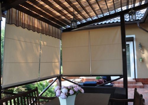 Просты в эксплуатации, не занимают много места, отлично препятствуют проникновению ярких солнечных лучей в помещение. Довольно часто для внешних штор выбирают полупрозрачные модели, они мягко притеняют веранду или беседку и не лишают возможности наслаждаться окружающим видом.