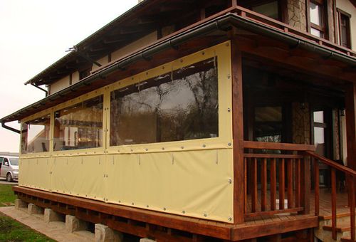 Плотная ткань защитит беседку или веранду, от ветра и дождя. Такие полотна выполняют только практическую функцию, так как в экстерьере они выглядят немного грубовато.