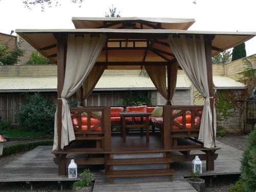На фото деревянная беседка, украшенная брезентовыми уличными шторами.