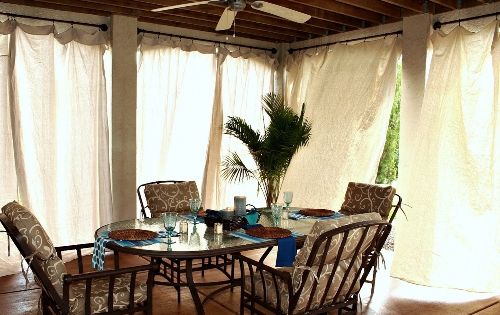 Придать большую функциональность таким занавескам поможет пропитка репеллентами против насекомых. После обработки ни комары, ни мошки не будут мешать отдыхающим проводить время на открытой веранде.