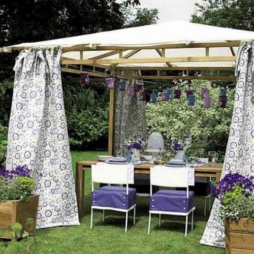 Однотонные шторы или занавеси с различными принтами, прекрасно вписываются в окружающий ландшафтный дизайн, создают настроение и делают помещение ярким. Легкие гардины особенно хорошо подходят для декорирования деревянной беседки.
