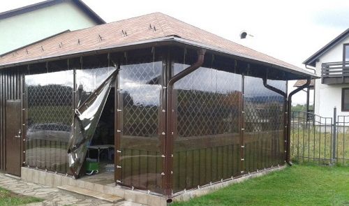 На фото беседка, отделанная пластиковыми уличными шторами из ПВХ.