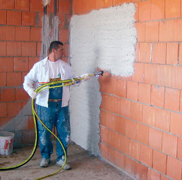 - Мастеру остается только держать шланг со штуцером и, направляя на стену, контролировать нанесение.