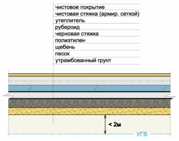 Схема обустройства бетонного пола с слоями гидроизоляции.