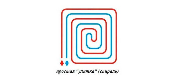 - улитка или по спирали. При таком способе укладывать трубы нужно по спирали. Это самый простой способ укладки водяного пола, который под силу даже непрофессионалам. Но при таком методе обеспечивается низкая теплоотдача, появляются холодные зоны. Именно поэтому «улитка» не пользуется огромной популярностью;
