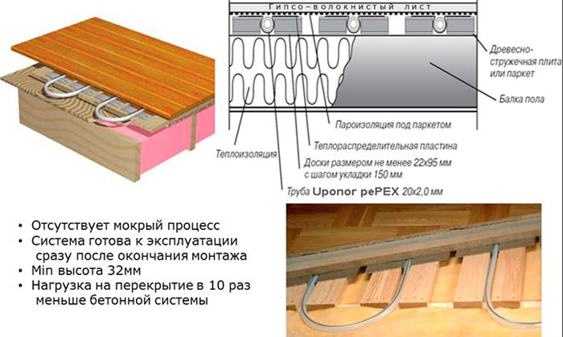 В отличие от бетонной стяжки, эти способы относятся к «чистым», и не требуют больших затрат времени. Стоимость такого монтажа значительно отличается от бетонного, зато при возникшем повреждении существует возможность доступа к трубам. Важно: подключать отопление можно сразу после завершения монтажа.