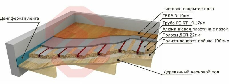 Плиты из дерева с пазами и пластинами из алюминия являются конструкцией из модулей. Система устанавливается так же, как и теплый пол на пенополистирольных матах. Отличие лишь в том, что здесь понадобится выполнить укладку утеплителя до установки плит из дерева. Далее в плиты устанавливаются пластины из алюминия, после чего трубы. Все это надо накрыть слоем звукоизоляции и напольным покрытием.