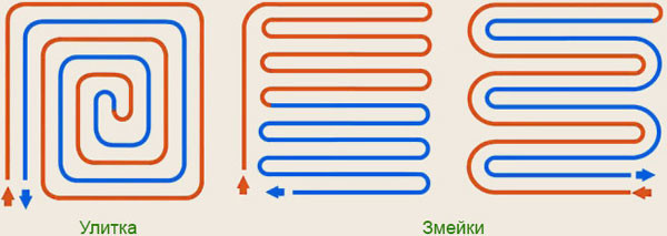 Давно придуманы наиболее эффективные виды монтажа труб – «улитка» и «змейка», поэтому экспериментировать с устройством контуров не придется.
