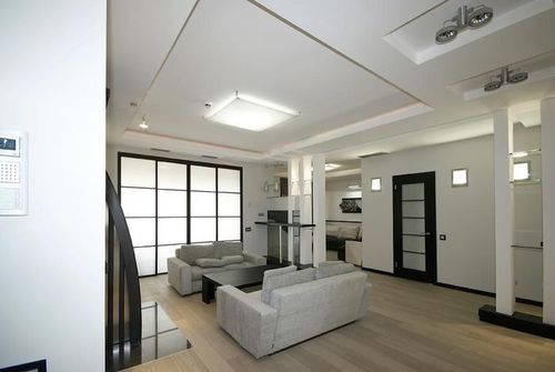 Интересным дизайнерским решением становится чередование матовых и глянцевых поверхностей. Межкомнатные двери использовались для оформления интерьера гостиной в стиле модерн.
