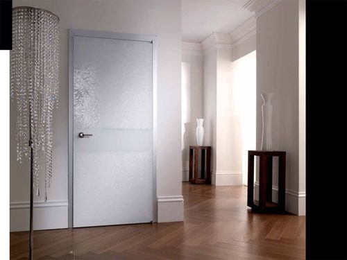 - Стекло. Когда нужно расширить пространство, наполнить комнату светом и сделать ее воздушной, используют стеклянные двери в стиле модерн. Больше всего они подходят для ванной или кухни, потому что они прочные и водостойкие, а также легкие в уходе. Они изготовляются из: каленого стекла, который прочнее обычного более, чем в 10 раз, идеального гладкого триплекса (двойного стекла с пластиком) и матолюкса, который прочнее в 5 раз, чем простое стекло. Последний не просвещается, поэтому не видно, что происходит дверьми с его использованием.