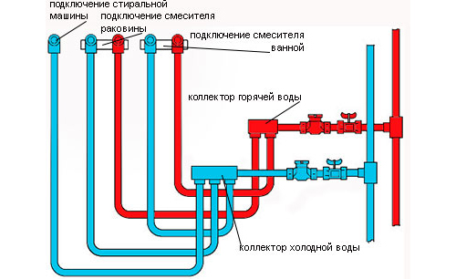 Для ее реализации от стояков холодного и горячего водоснабжения выполняются отводы, ведущие к первому потребителю. От него прокладываются трубы ко второму и далее. Каждая точка водоразбора оборудуется тройником, к одному из отводов которого подключается потребитель.