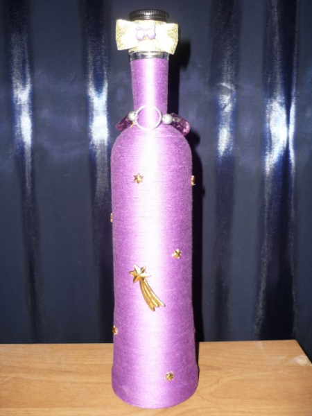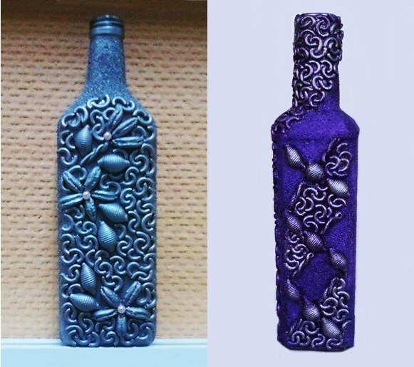 Далее, чтобы украшения лучше держались, необходимо обработать бутылку жидкостью для снятия лака. Это позволит удалить клей и загрязнения, которые могут помешать декорированию. И последний, завершающий этап – обработка стекла спиртовым раствором. Это поможет удалить с поверхности жирные пятна и налет от пальцев. Проделав такие нехитрые манипуляции с бутылкой, можно переходить непосредственно к украшению.