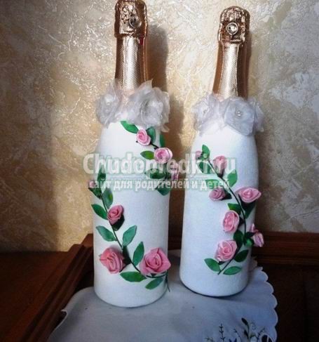 Если такая техника кажется для вас слишком сложной, можно изготовить красивое украшение из ткани подходящего цвета в виде мешочка, в который устанавливается вино или шампанское.