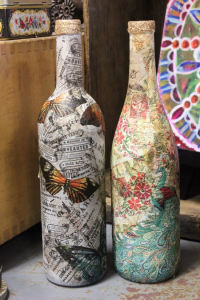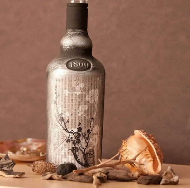 Техника декупаж – это аппликация, выполненная из различных материалов, которым легко придать форму. Разнообразные картинки вырезаются, крепятся или клеятся на украшаемой поверхности с последующей обработкой. Для начинающих процесс покажется неосуществимым, но это только на первый взгляд. Главное условие – терпение и немного фантазии. В результате получится шедевр, ничем не уступающий антиквариату. Эта идея и натолкнула домашних рукодельниц на мысль о создании презентов к Новому Году из бутылок своими руками.
