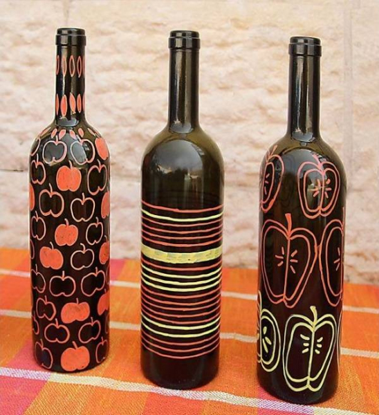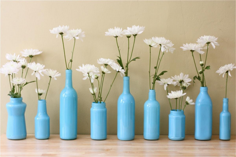 В первую очередь подготовить бутылку вина, поместив в емкость с теплой водой таким образом, чтобы намокли этикетки. Выдержать, пока они не отойдут. Затем при помощи ватного диска нанести на бутылку жидкость для снятия лака и обезжирить поверхность. После покрасить белым. Количество слоев зависит от кроющей способности краски, сквозь которую не должно просвечивать стекло.