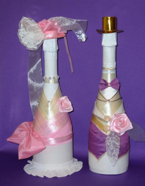 Отдельной категорией являются бутылки, украшенные атласными лентами. С их помощью можно изготовить красивый съёмный чехол. Для работы можно использовать как узкие, так и широкие ленты. В первом случае получается плотное украшение, во втором случае можно сформировать объёмный декор.