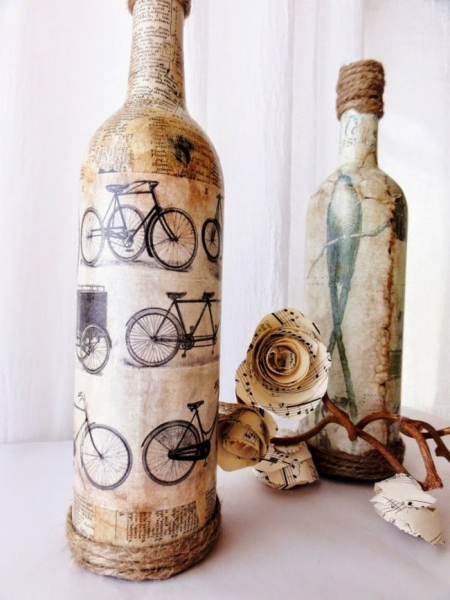 Даже если вы приобрели бутылку алкоголя на этой неделе, её можно искусственно «состарить» путем декорирования старой газетой. Работы выполняются в следующей последовательности: