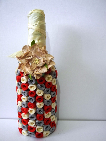 Чтобы добиться желаемого результата, необходимо обернуть вино или шампанское бумагой подходящего цвета, а затем добавить декоративные элементы.