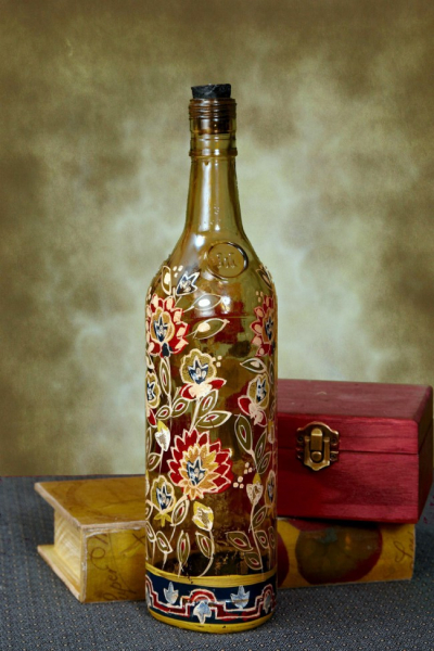 После высыхания ткани на бутылке, наносим декупажную салфетку и покрываем на свое усмотрение краской