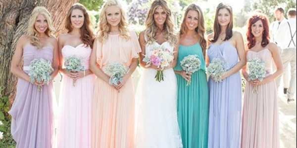 Актуальны любые цветочные цвета – голубой, розовый, светло-зеленый. Особое внимание стоит уделить выбору ткани, она должна выглядеть празднично. Вязаные изделия, шерсть лучше оставить для другого случая, даже если вечеринка проводится зимой. Основное правило – подруги новобрачной должны красиво выглядеть на фото, но не затмевать виновницу торжества. Наконец, платья не должны препятствовать бесконечным танцам.