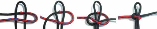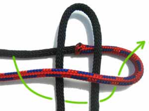 Левую веревку нужно положить поверх шнура-основы и повернуть оба конца веревки так, чтобы справа образовалась петля. Затем правым витком веревки нужно обогнуть левый вверху, а конец левого витка пропустить в петлю снизу вверх. Теперь остается только потянуть за два конца шнура и сформировать узел.