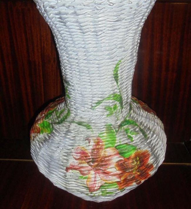 Поскольку бумага намного мягче лозы, постарайтесь, заправляя трубочки в конце плетения, закреплять их клеем ПВА на изделии. Оставьте на ночь, чтобы работа просохла, и с утра продолжайте отделку.