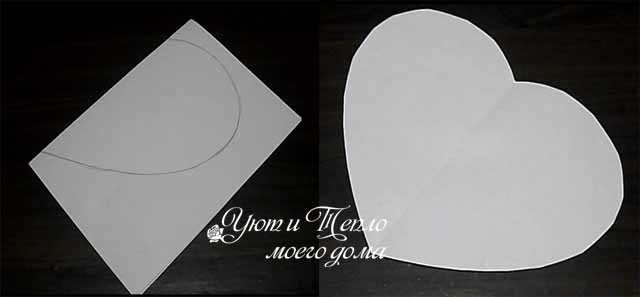 Для построения выкройки я взяла лист бумаги, сложила его пополам и нарисовала половину сердечка произвольной формы. Вырезала и развернула, чтобы посмотреть, устраивает ли меня такой вид. В первой попытке сердечко вышло слишком зауженное к низу, поэтому я нарисовала новое.