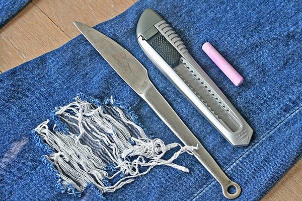 - Острым, как бритва, канцелярским ножом сделать порезы вдоль намеченной лини. Рваные таким образом джинсы должны смотреться слегка небрежно, поэтому движения должны быть резкими и относительно неаккуратными.