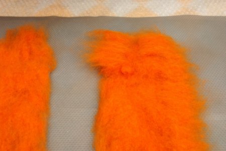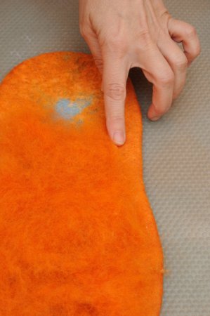Если Вы чувствуете, что шерсть начинает уплотняться, то усилие можно прибавлять. К зеленому цвету переходим только после того, как оранжевая шерсть полностью прилегла плотно к шаблону.